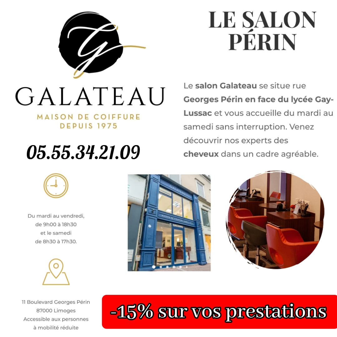 avec votre adhésion, bénéficiez de 15% sur votre prestation (hors forfait jeune) chez notre partenaire GALATEAU salon de coiffure, 11 bd Georges Périn LIMOGES.